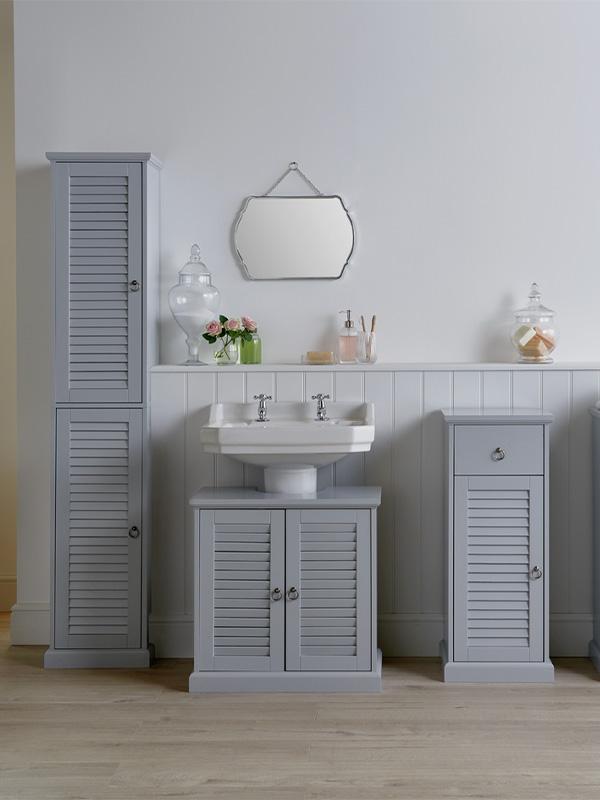 A corner bathroom storage unit or cabinet can work well in smaller bathrooms, and a narrow storage cabinet is equally effective when space is at a premium.